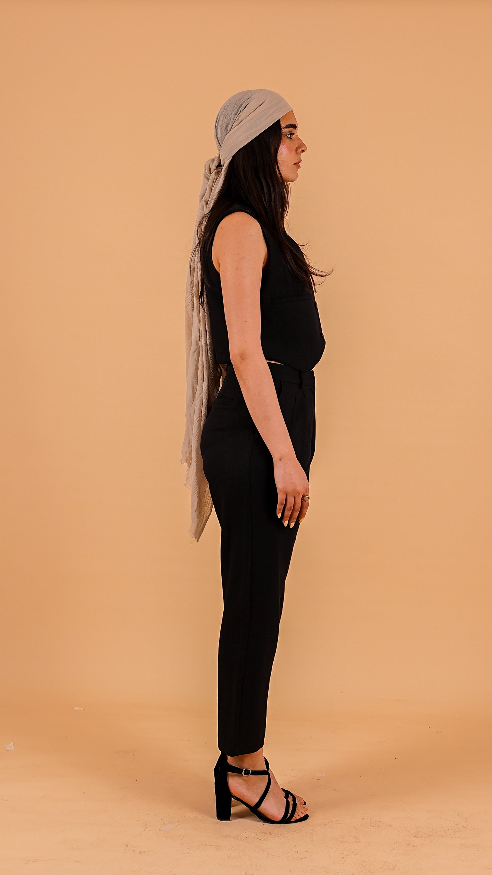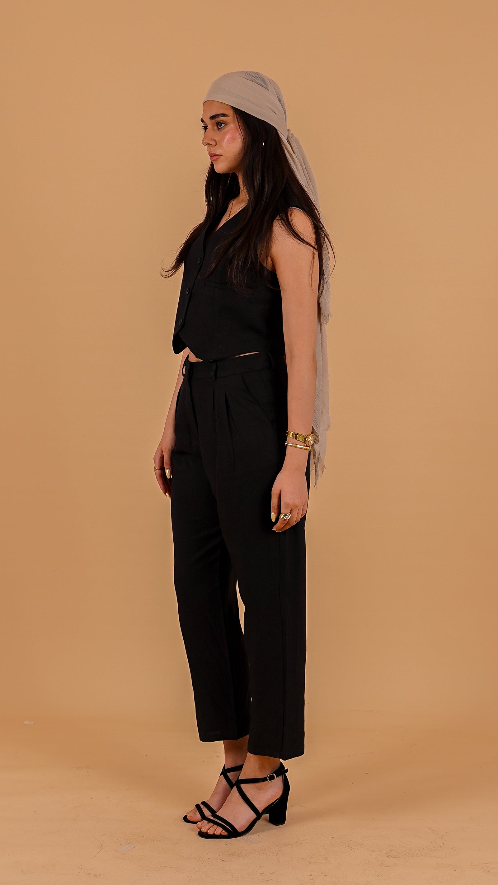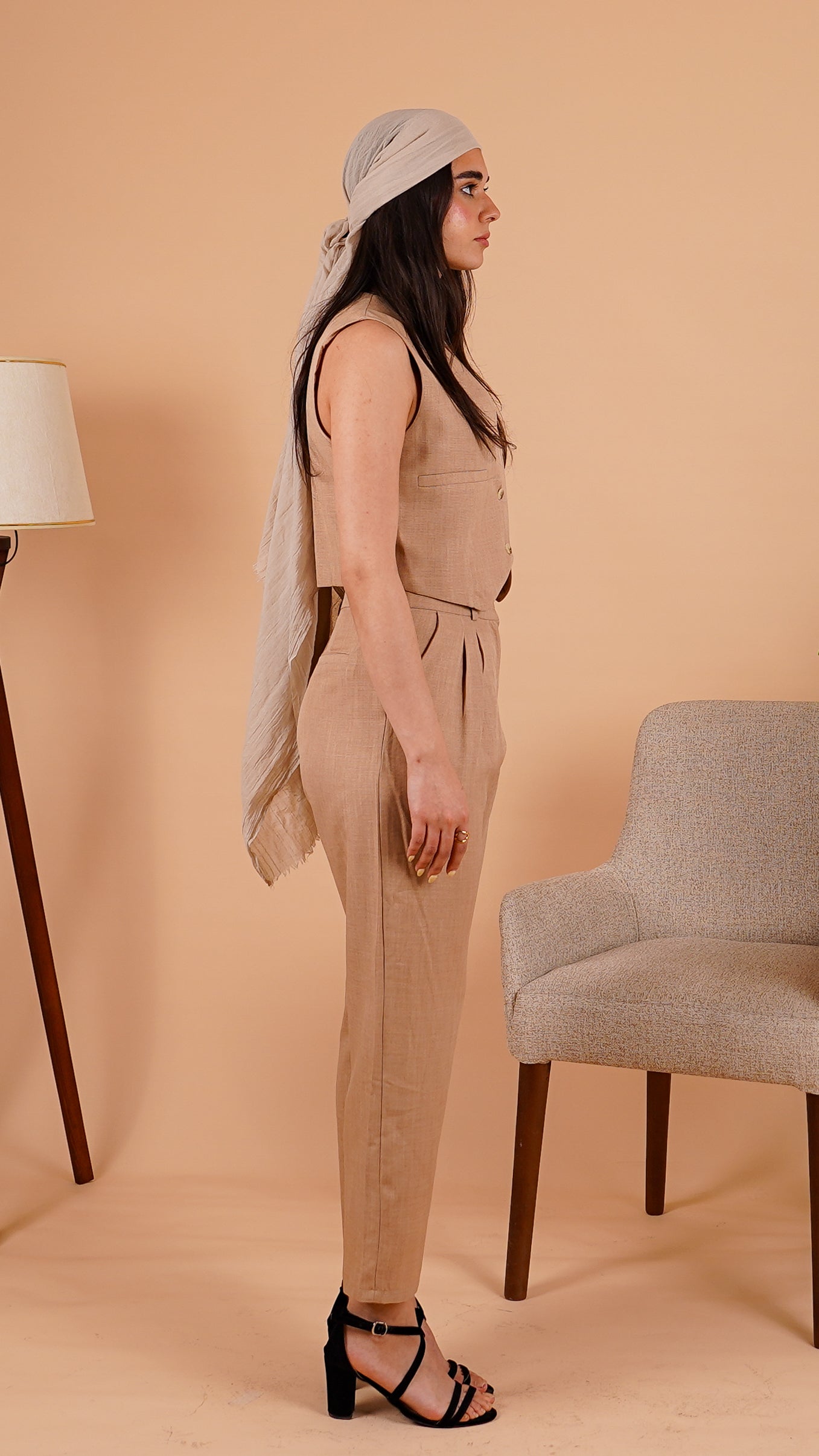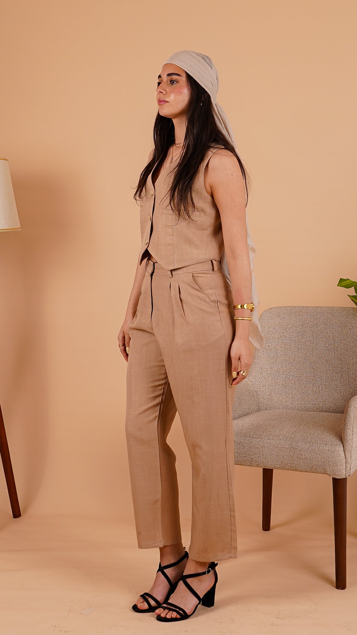 Breezy linen in a timeless neutral, featuring a cropped sleeveless vest and high-waisted pleated trousers. Designed for relaxed tailoring with effortless polish—wear together or mix and match for versatile, warm-weather style.